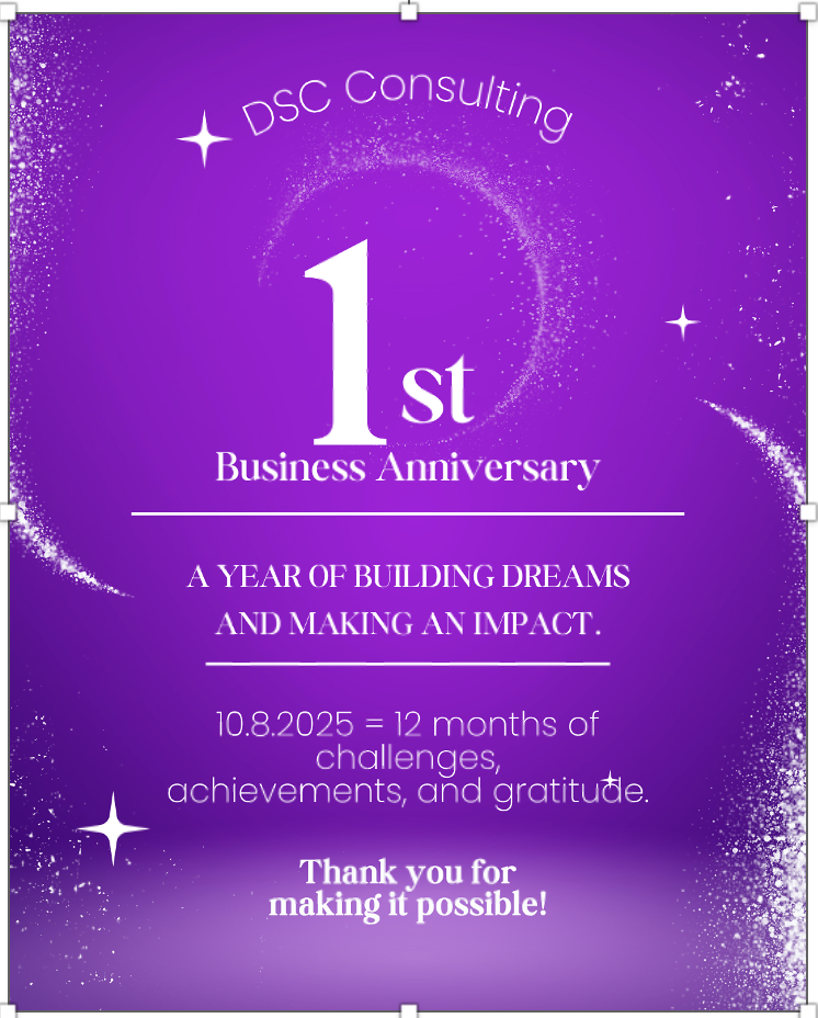 On October 8, 2025, DSC Consulting celebrates its first business anniversary—marking one full year since founder Dr. Dana Starr Cummings launched the firm and stepped into the world of entrepreneurship. It’s a milestone that brings with it a mix of joy, reflection, and deep gratitude.